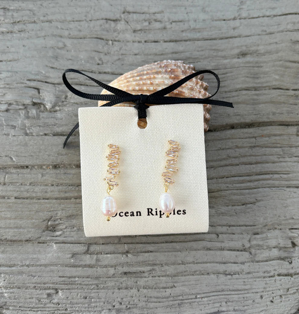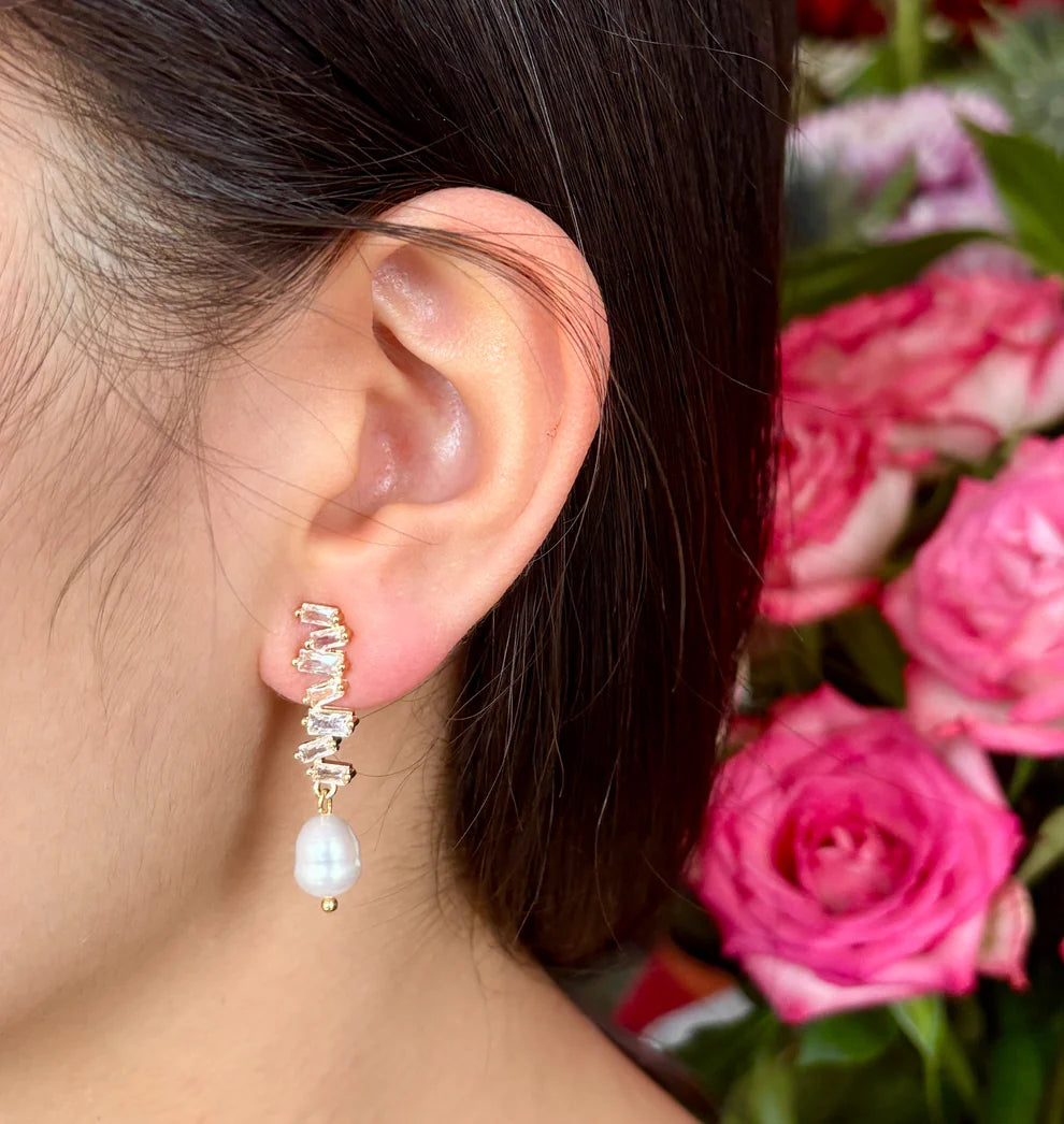 14ct Gold Plated Fresh Water Pearl Zirconia Zigzag Earrings