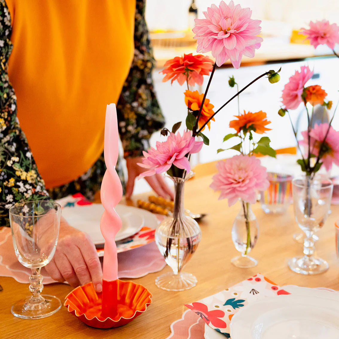 Brighten your space with the Orange Scalloped Metal Dinner Candle Holder. Its trendy orange enamel finish and charming scalloped edges add a playful touch to any table or mantle. Sized perfectly at 5cm high by 14cm wide, it features a deep drip tray to catch wax and is just as lovely solo as when paired with the pink and green versions for a fun, colourful statement.