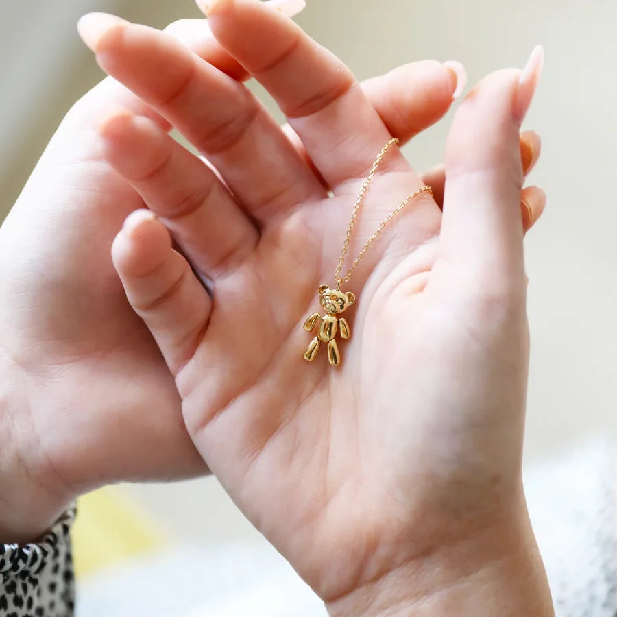 Bring back the magic of childhood with this delightfully quirky teddy bear pendant. Watch your little friend come alive as its limbs swing freely, creating the illusion of a joyful dance with every movement. Suspended from a graceful trace chain and secured with a reliable lobster clasp, this golden treasure strikes the perfect balance between whimsy and elegance. Whether you're treating yourself or gifting someone special, this playful piece captures nostalgia in the most charming way possible.